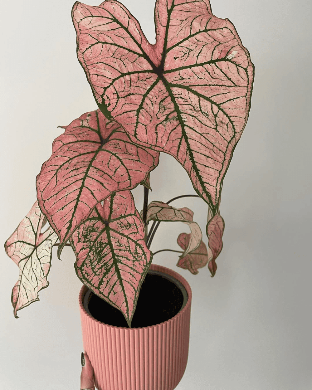 Caladium Carolyn Whorton is bold, bright, and unapologetically vibrant. The large, heart-shaped leaves are splashed with shades of pink, accented by red veins and bordered with green edges. This variety doesn’t just sit in a room—it owns it. Carolyn Whorton thrives in well-lit spaces where its colors can shine, making it a centerpiece in any urban jungle.